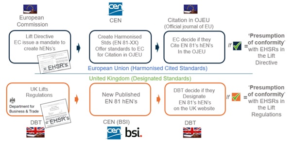 The process is as follows: after a standard is published in the EU and listed in the OJEU, the UK begins its designation process. On the day after the OJEU listing, the standard is opened for objection for 28 days. If there are no objections, then on day 29 the standard is listed on the GOV.UK website and lift contractors may treat it as offering a presumption of conformity and cite it on the Declaration of Conformity (DoC).