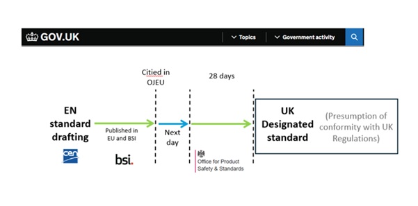 A similar approach applies in the UK. Standards are published by BSI at the same time as in the EU, but they do not automatically provide a presumption of conformity. This is only possible once the UK formally adopts the standard and it is listed on the GOV.UK website.